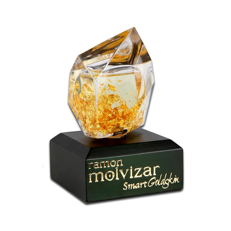 بطری رامون مولویزار اسمارت گلد اسکین به شکل الماس تراش نخورده طراحی شده است. درون بطری با ورقهایی طلایی ۲۳ عیار پر شده و این عطر را زیباتر کرده است. مایع درون بطری به همراه ورقهای طلایی معلق در آن از روی شیشه دیده میشود.